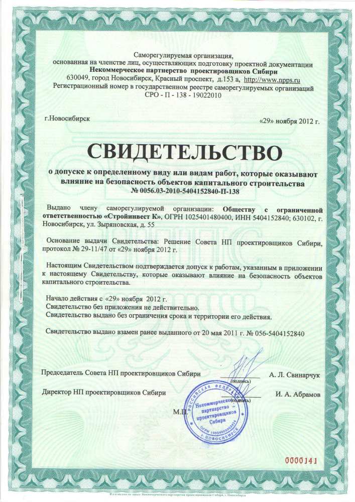 Строительная компания ООО "Стройинвест К"ООО Стройинвест К основано 07 декабря 1998 года.Основным видом деятельности является строительство обьектов различного назначения: многоквартирные жилые дома (со встроенно-пристроенными помещениями различного назначения: детские сады, офисные помещения, музыкальные школы и т.п.), общественно-торговые здания, обьекты городского водопроводно канализационного хозяйства (магистральные водоводы, коллектора, крупнейшие за Уралом очистные сооружения г.Новосибирска). ООО Стройинвест К выполняет и может выполнять следующие функции: застройщик, заказчик, проектировщик, генеральный подрядчик, инвестор (участник долевого строительства).